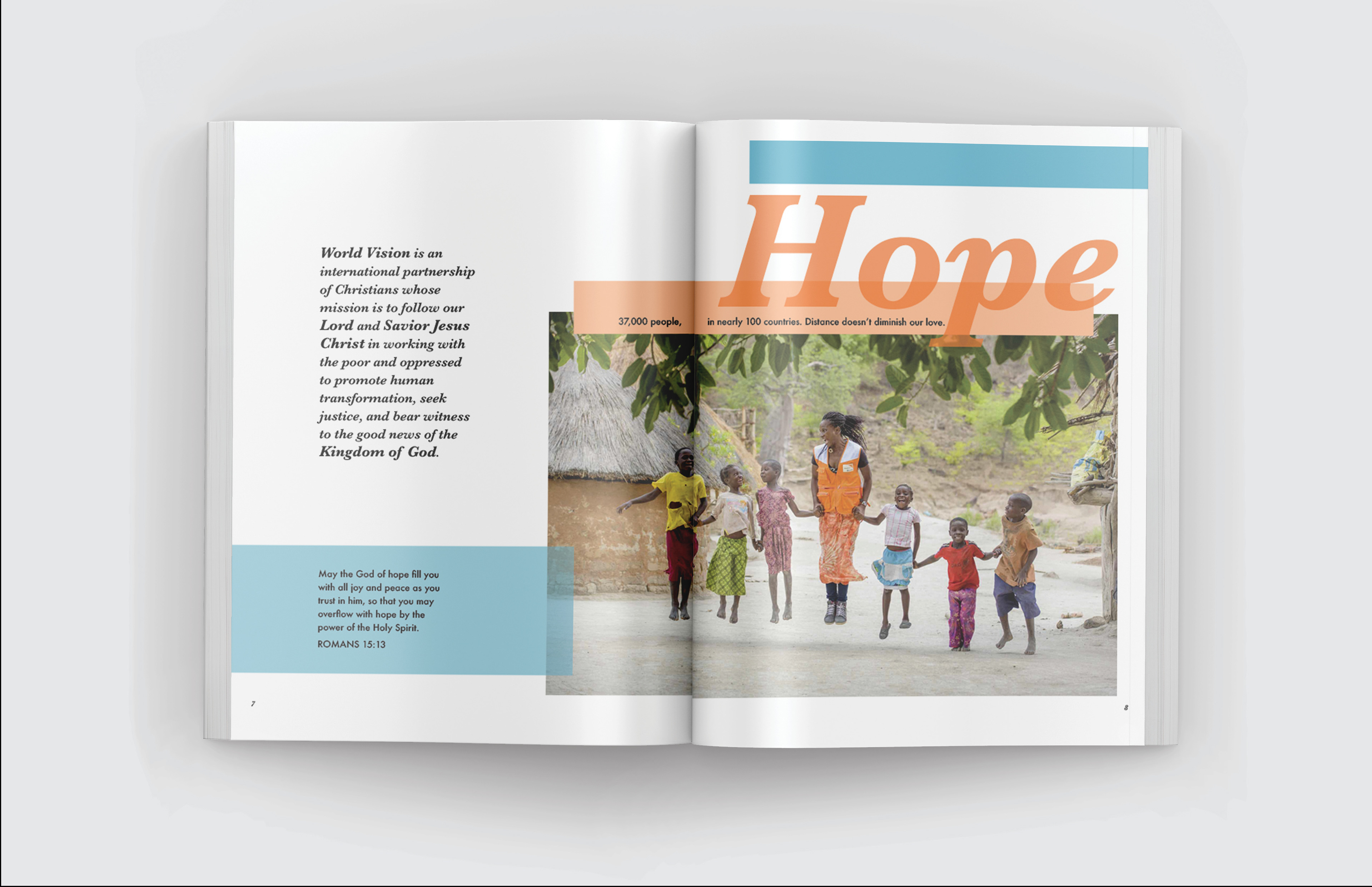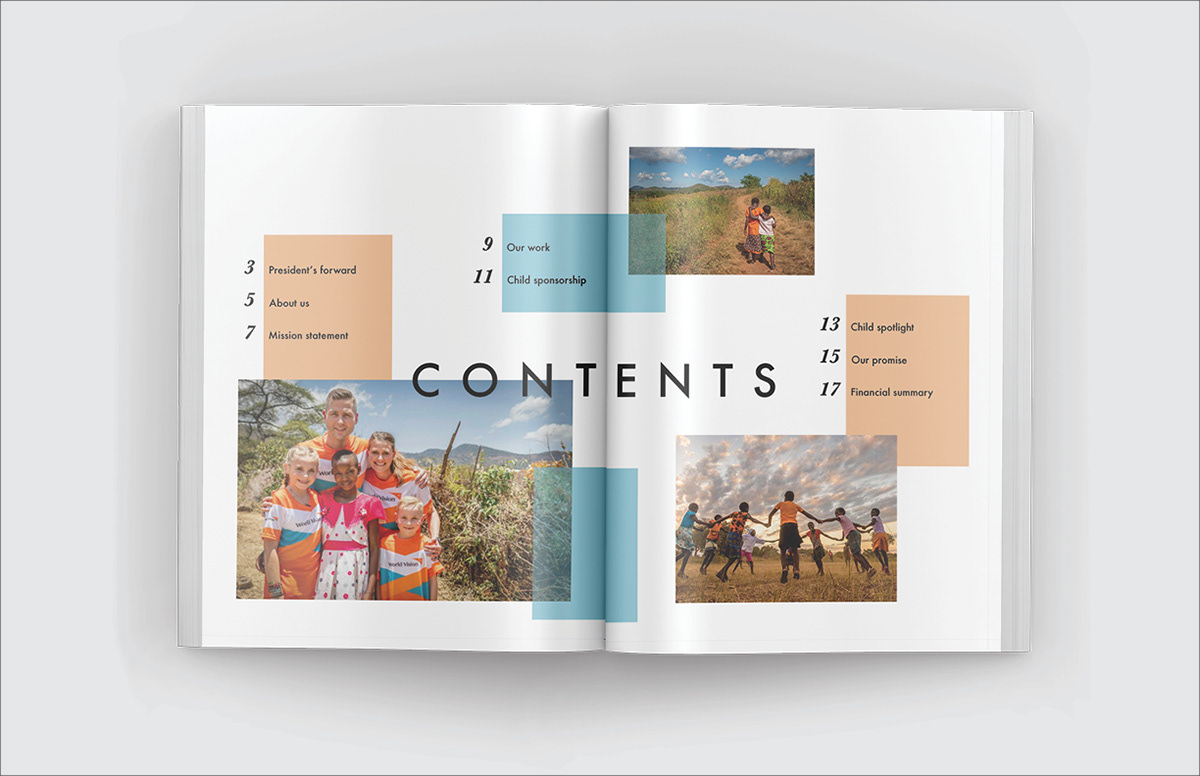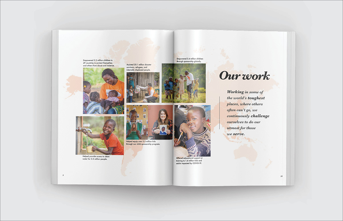 Designed a 2020 annual report for World Vision, a humanitarian aid organization. They partner with children, families, and their communities to reach their full potential.